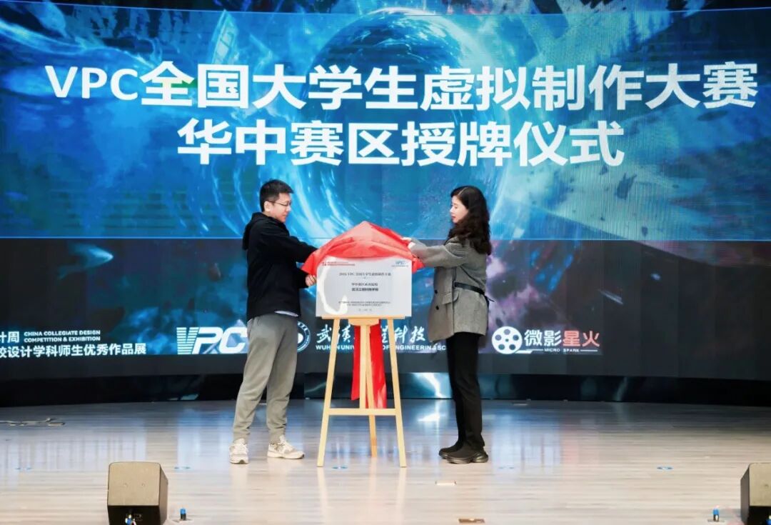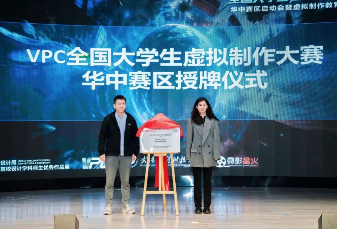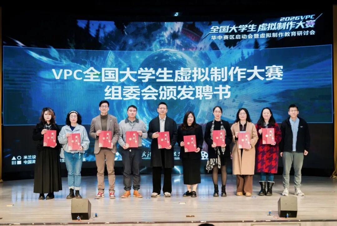 在全场见证下,廖璐莎与谢宁共同完成华中赛区授牌仪式,并由谢宁为华中赛区组委会成员、专家指导老师颁发聘书。与会领导、嘉宾共同上台,标志着2026 VPC全国大学生虚拟制作大赛华中赛区正式启动。