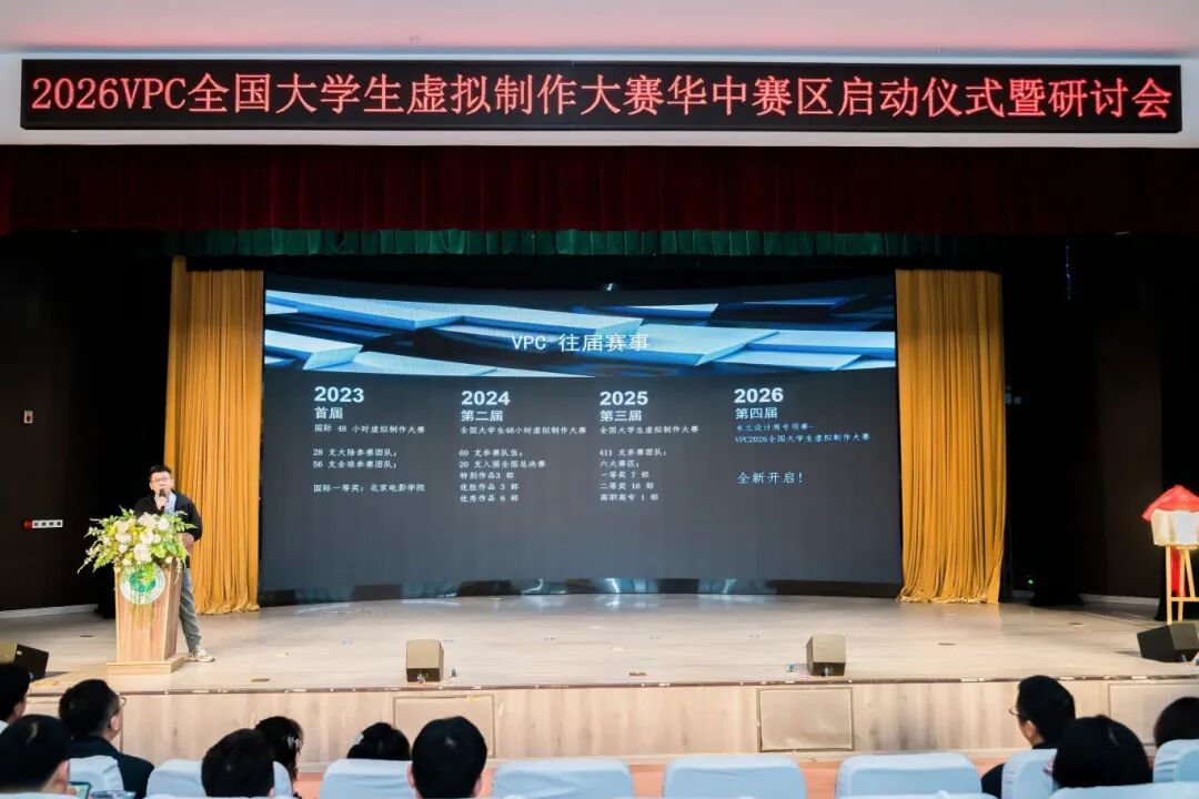 VPC全国大学生虚拟制作大赛组委会执行委员会主任谢宁在致辞中指出,虚拟制作、AI与游戏引擎的深度融合,标志着虚实结合、实时交互的时代已经到来。虚拟制作并非影视行业专属,而是设计、动画、新传、文旅等多领域的通用技能,是虚实融合时代的核心能力,也是大赛培养学生此项能力的初衷。他介绍,2026年VPC大赛迎来重磅升级,正式成为“米兰设计周”专项赛道并入选教育部白名单赛事体系,参赛范围已扩大至动画、设计、新传等专业,鼓励跨学科融合创新。为支持华中赛区,组委会联合多家头部企业,将前沿技术与产业资源直接引入,通过提供从电影级LED到轻量级手机方案的全梯度技术支持,以及后续的实操工作坊和一对一指导,让学生在校期间就能接触行业一线标准。他寄语华中赛区学子大胆参与、认真创作,力争将华中赛区打造为全国最亮眼的赛区之一。