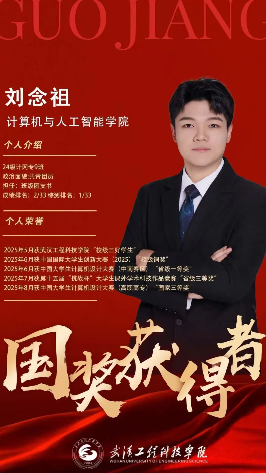 刘念祖寄语学弟学妹们:“抓住当下每一个成长的机会,从课堂起步,扎实掌握专业课基础知识。向身边优秀同学看齐,汲取他们的长处。以积极进取的心态拥抱机遇与挑战,在逐梦路上稳步前行。”