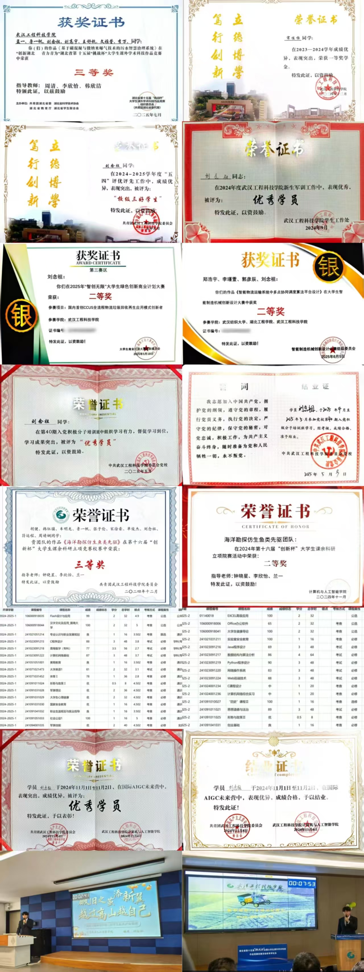 道阻且长,行则将致。进入大学后,刘念祖为自己定下了清晰且务实的目标:力争评优评先,以榜样姿态严格要求自己,同时扎实考取专业相关资格证书,夯实学业基础。他积极参加各类竞赛,屡获佳绩,包括2024年“冰雪杯”全国大学生外语能力大赛“一等奖”、2024年12月国际大学生创客马拉松大赛“二等奖”、2025年6月中国国际大学生创新大赛“校级铜奖”、2025年6月中国大学生计算机设计大赛“省级一等奖”、同年7月第十五届“挑战杯”大学生课外学术科技作品竞赛“省级三等奖”,以及2025年8月中国大学生计算机设计大赛“国家三等奖”。令他尤为难忘的是在中国大学生计算机设计大赛答辩前夕,设备服务器突发故障。紧急情况下,他与队友迅速响应、协力修复,最后成功克服困难,取得优异成绩。“这些挫折和突发状况,极大地考验并提升了我们团队的应急处理能力。”谈及收获,他表示,这些经历不仅促进了个人成长,还在知识拓展、组织协调与应变能力等多个维度带来了全面提升。
