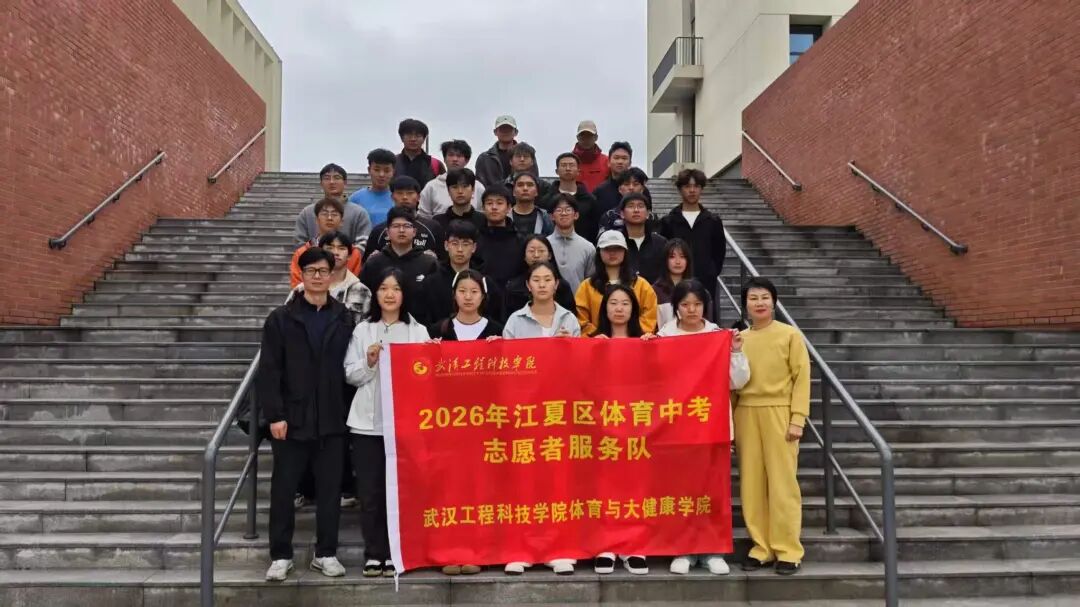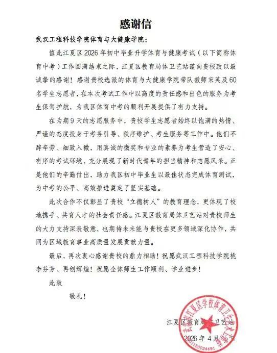 近日,武汉市江夏区2026年初中毕业升学体育与健康考试(体育中考)工作已圆满结束。武汉工程科技学院新活力体育产业学院、体育与大健康学院选派60名学生志愿者团队,全程参与了为期9天的考务辅助工作,其工作获得了主办方的高度认可。江夏区教育局体卫艺站特向学院发来感谢信,对志愿者团队的辛勤付出与专业表现致以诚挚谢意。